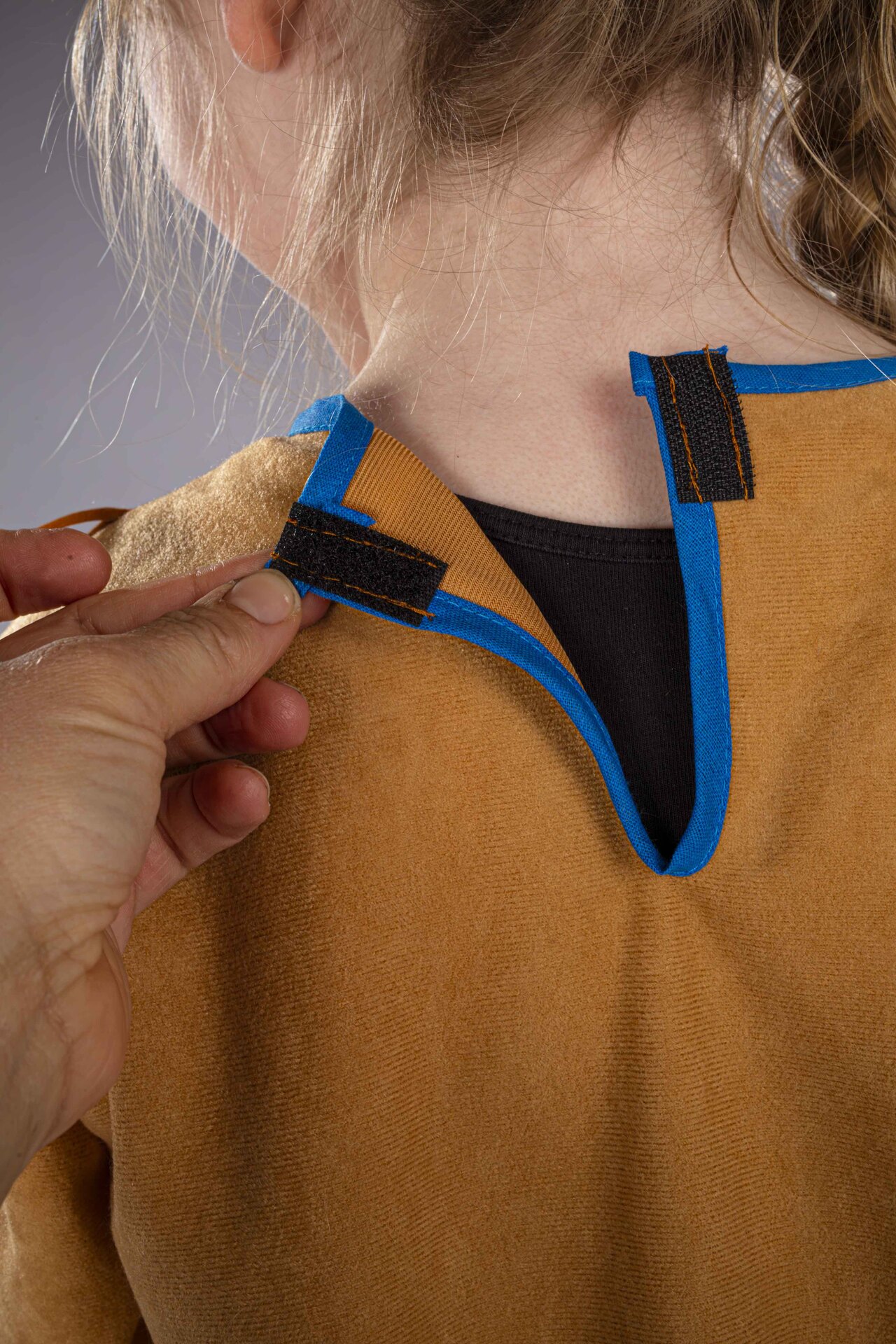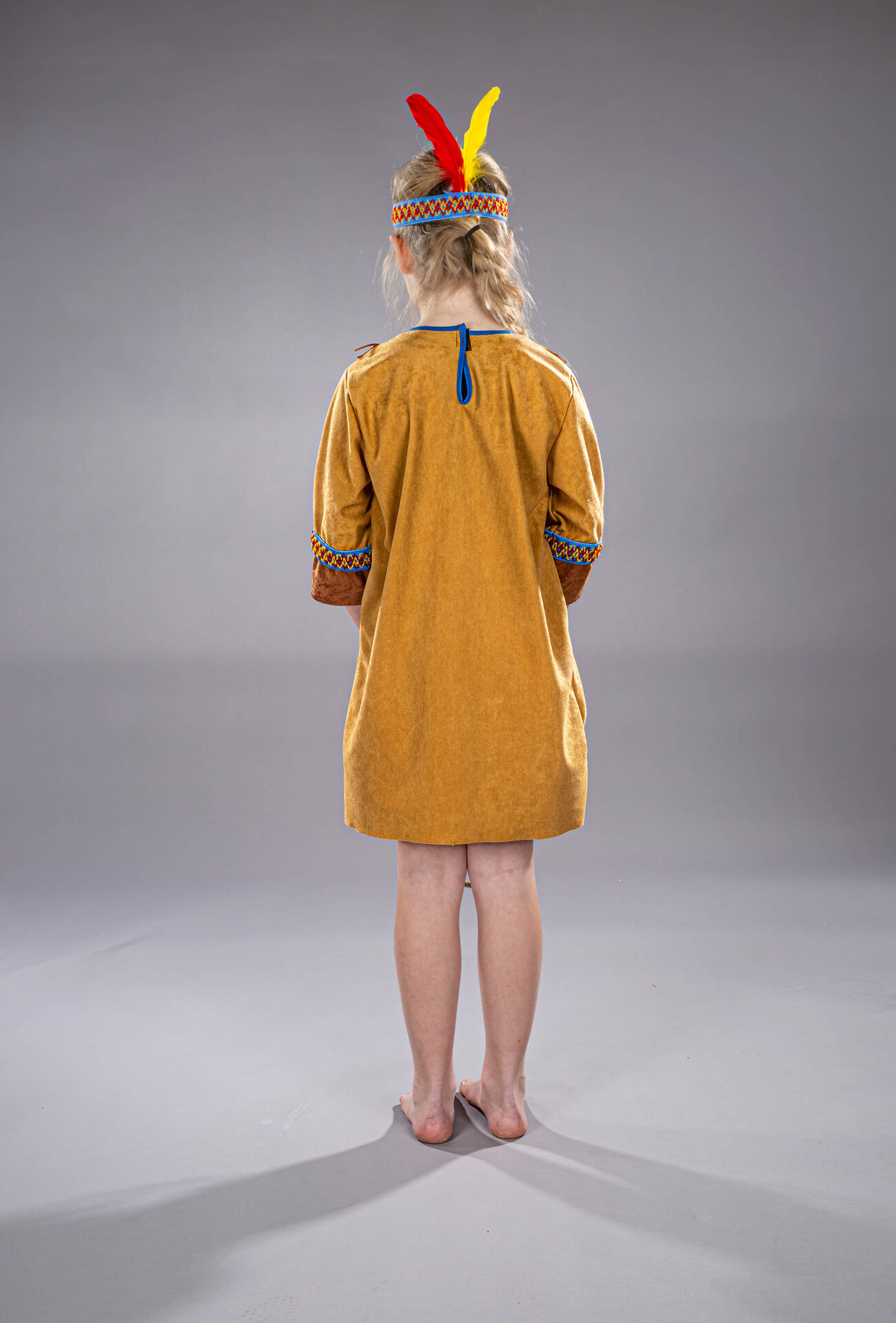 Kleid aus Waschvelours in Wildlederoptik mit blauer Borte und braunen Fransen. Das im Lieferumfang enthaltene, passende Stirnband mit Federn rundet das Ensemble ab.
