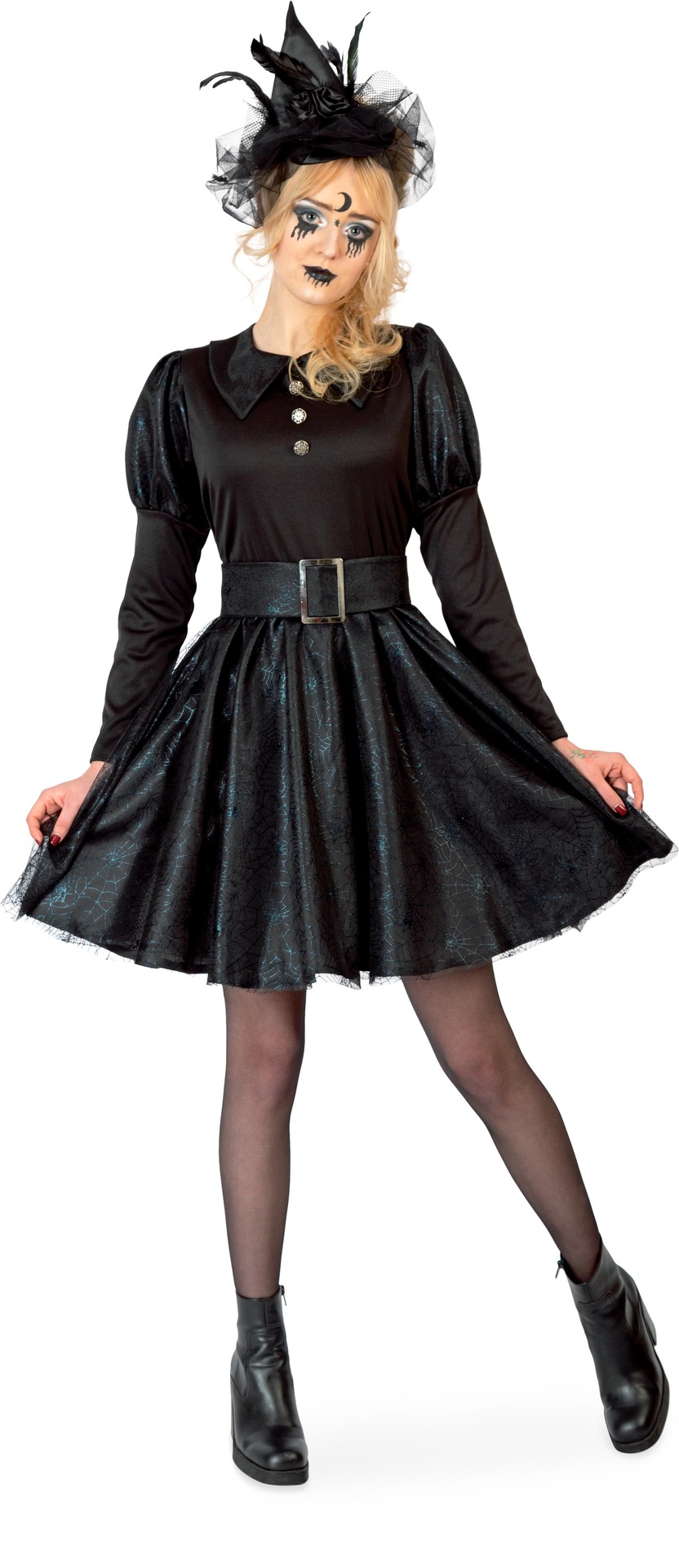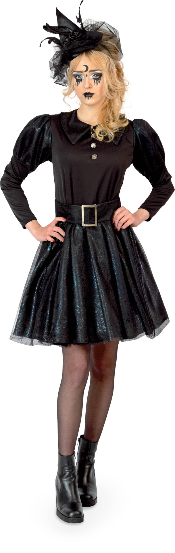 Hexe Mara: schwarzes Kleid mit Gürtel. Der Spitzkragen, die silbernen Knöpfe und der Überrock aus Spinnwebentüll setzen Akzente. Ein Hut gehört nicht zum Lieferumfang.