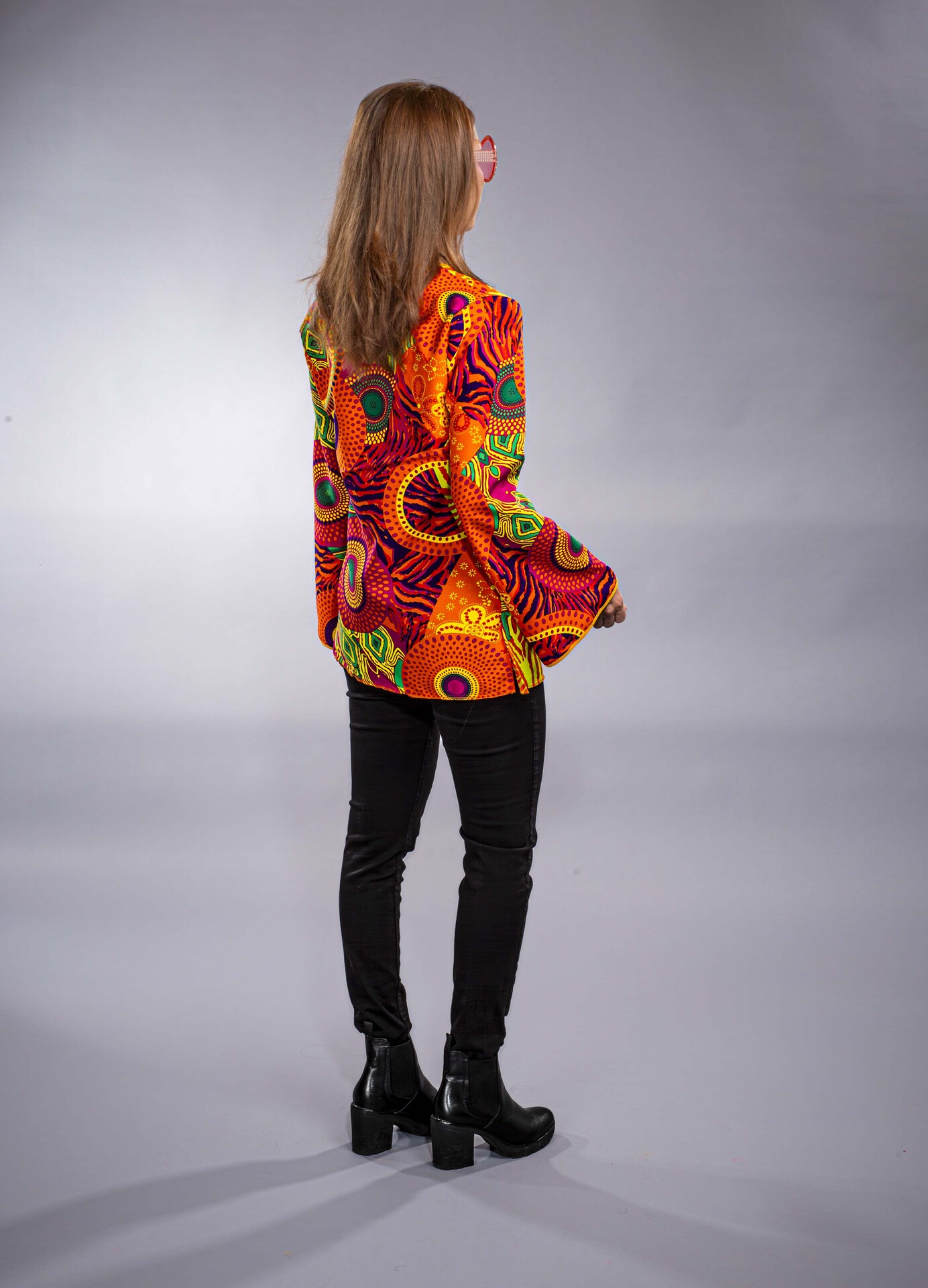Hippie-Bluse mit Rundhalsausschnitt und weiten Trompetenärmeln.