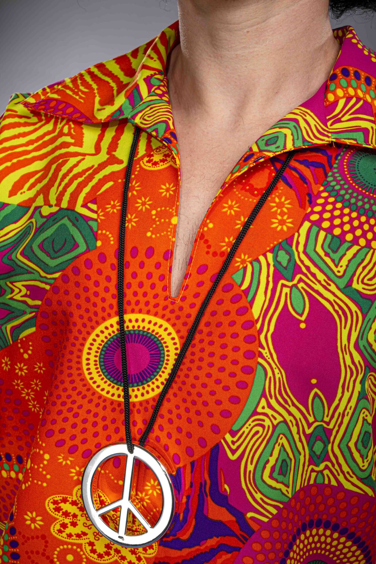 Hippie-Shirt mit breitem Spitzkragen, V-Ausschnitt und weiten Ärmeln.