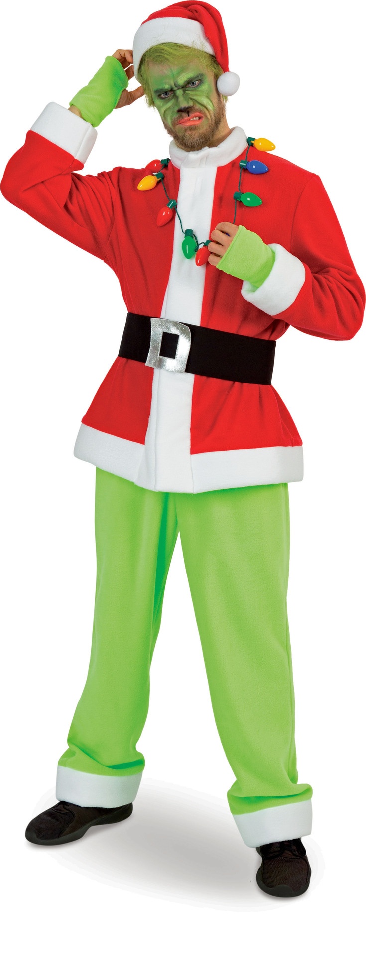 Das perfekte Kostüm für alle Weihnachtsmuffel. Jacke und Hose sind aus kuscheligem Fleece, eine Filzmütze, ein paar fingerlose Stulpen und ein Gürtel komplettieren das Ensemble.