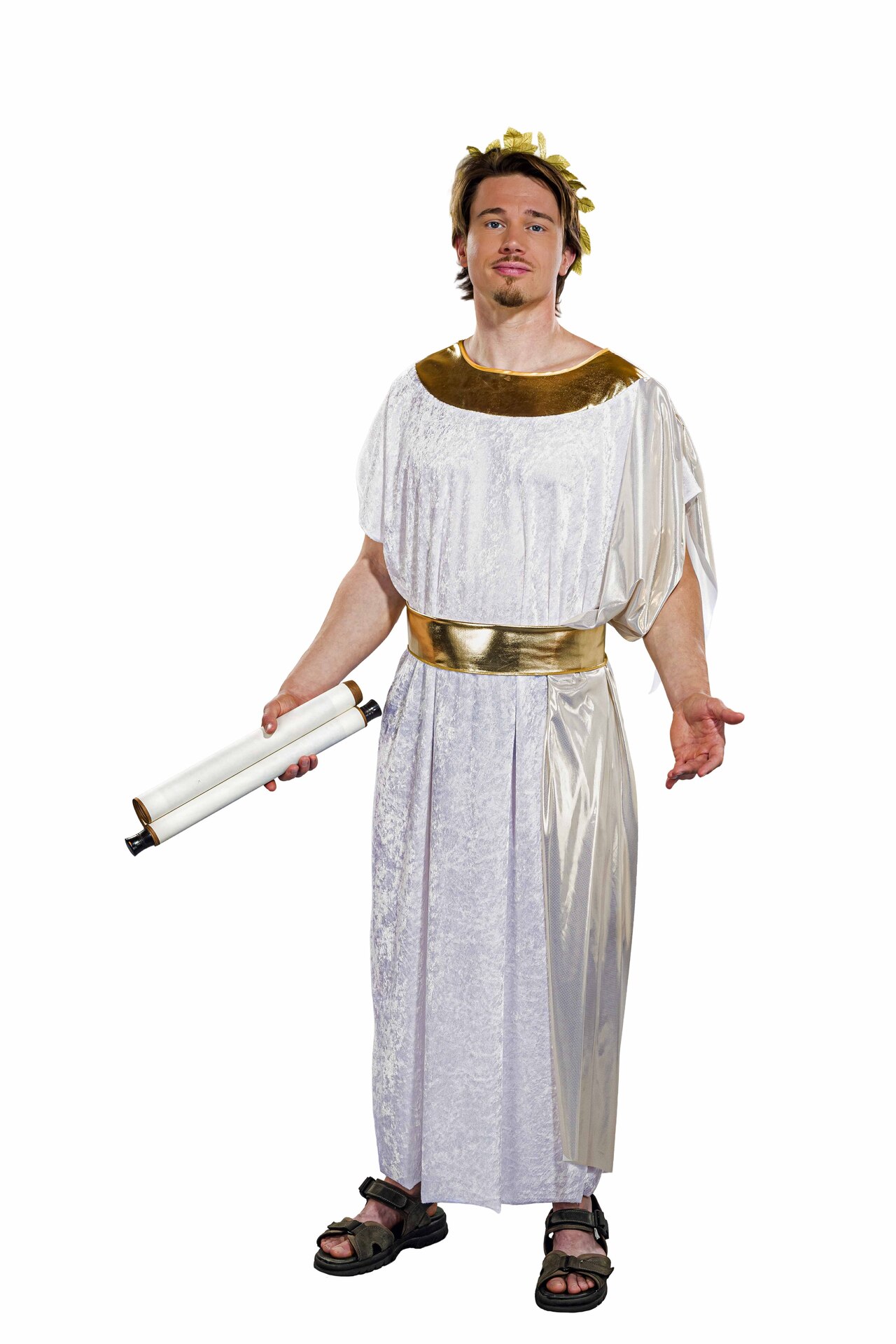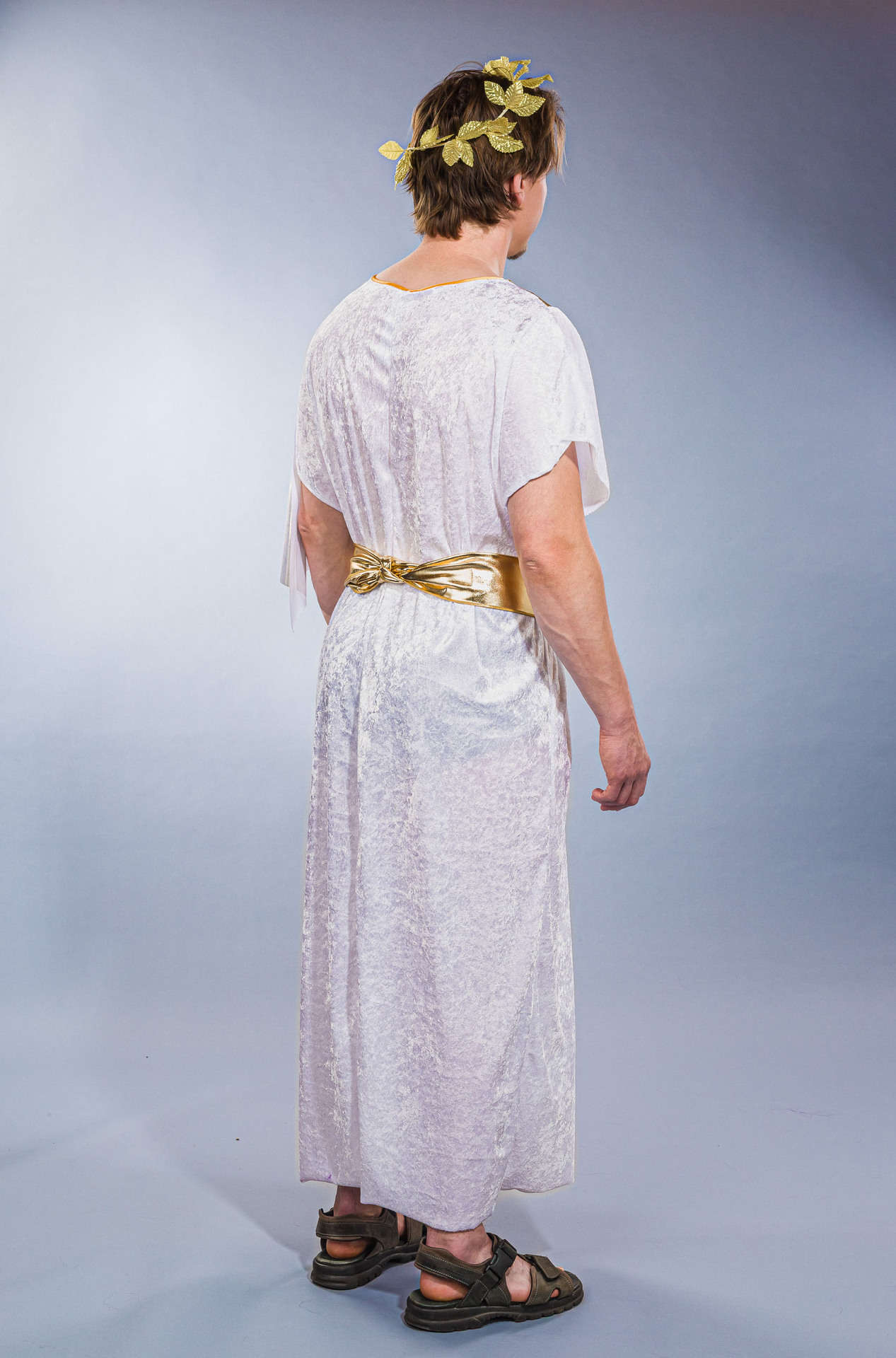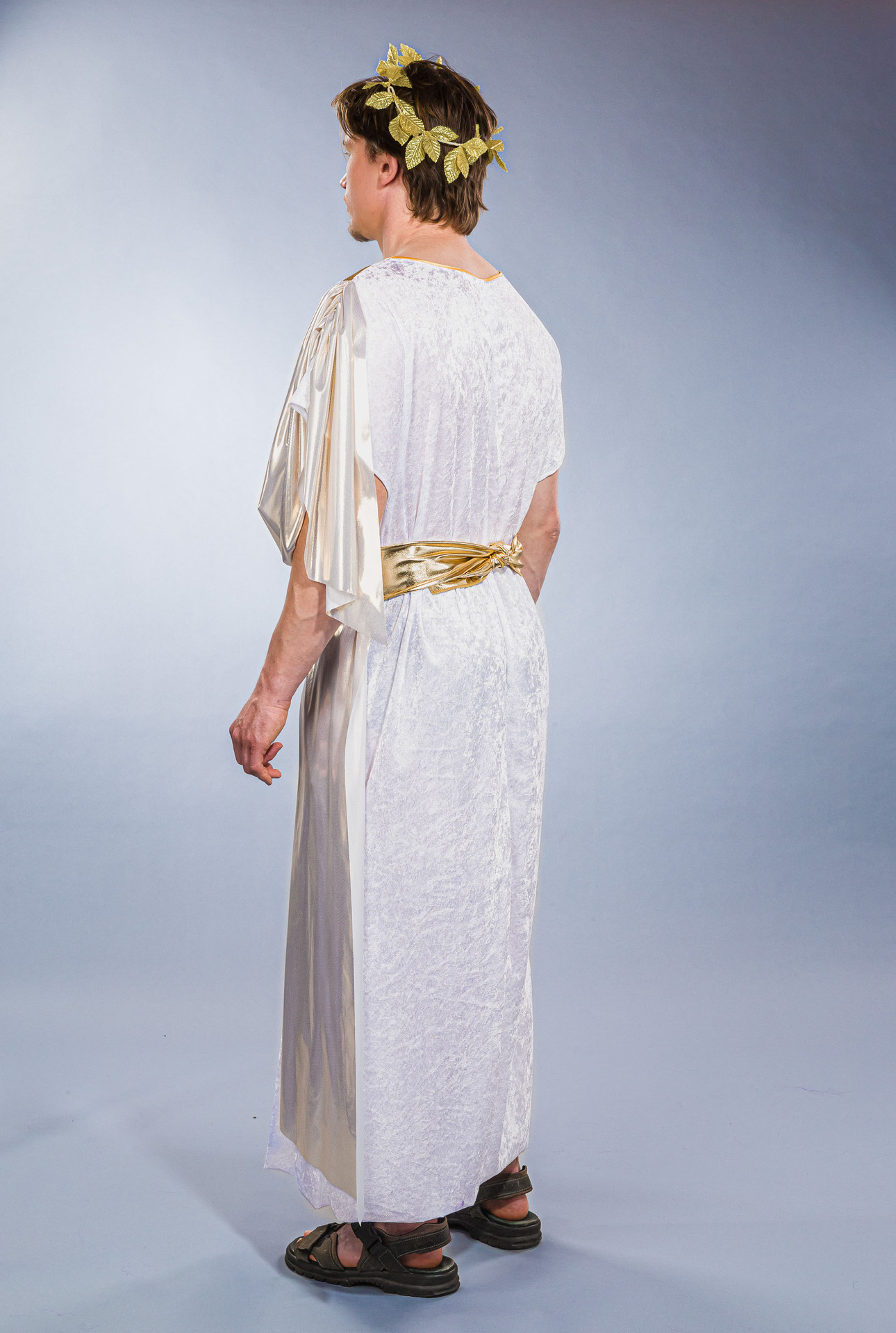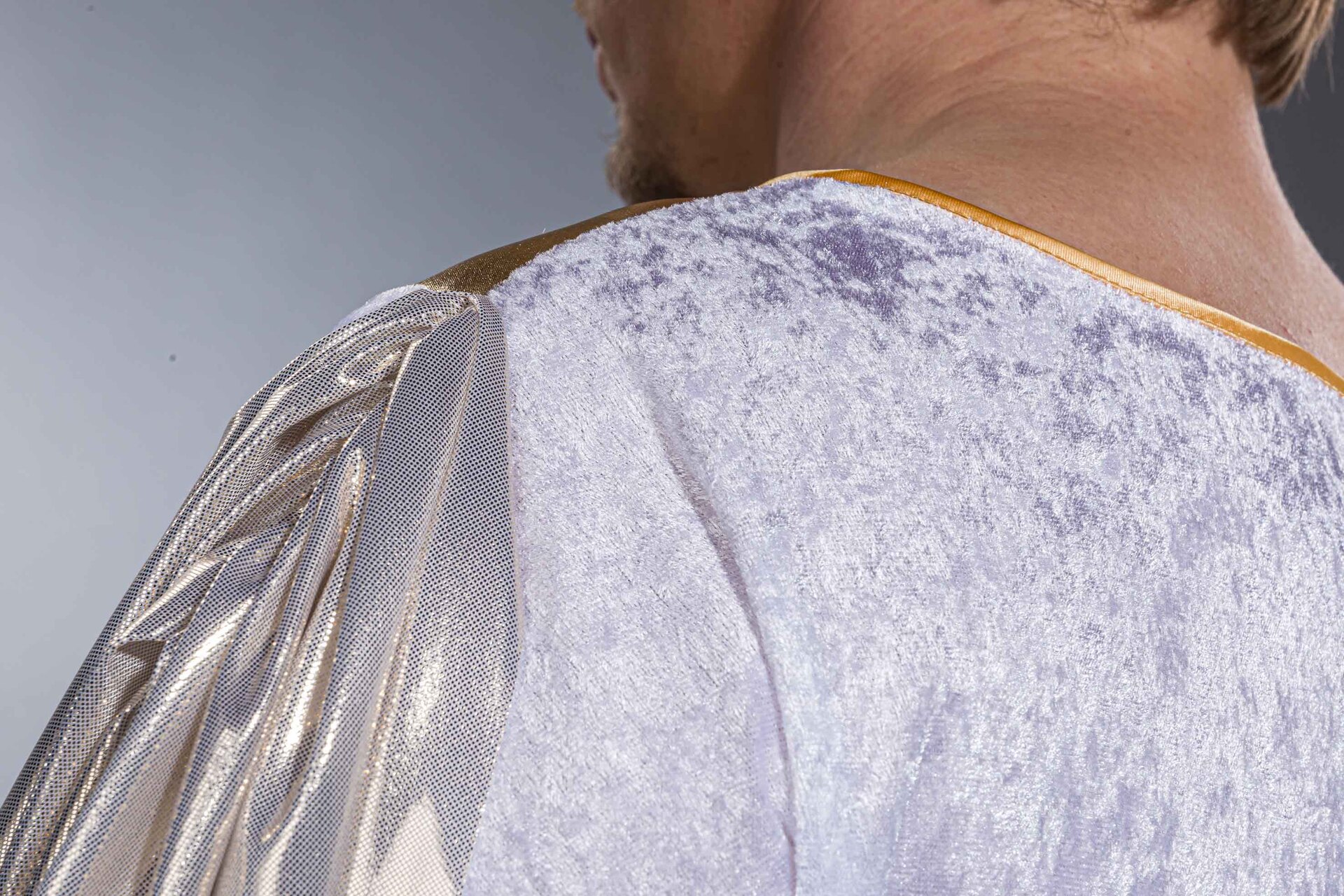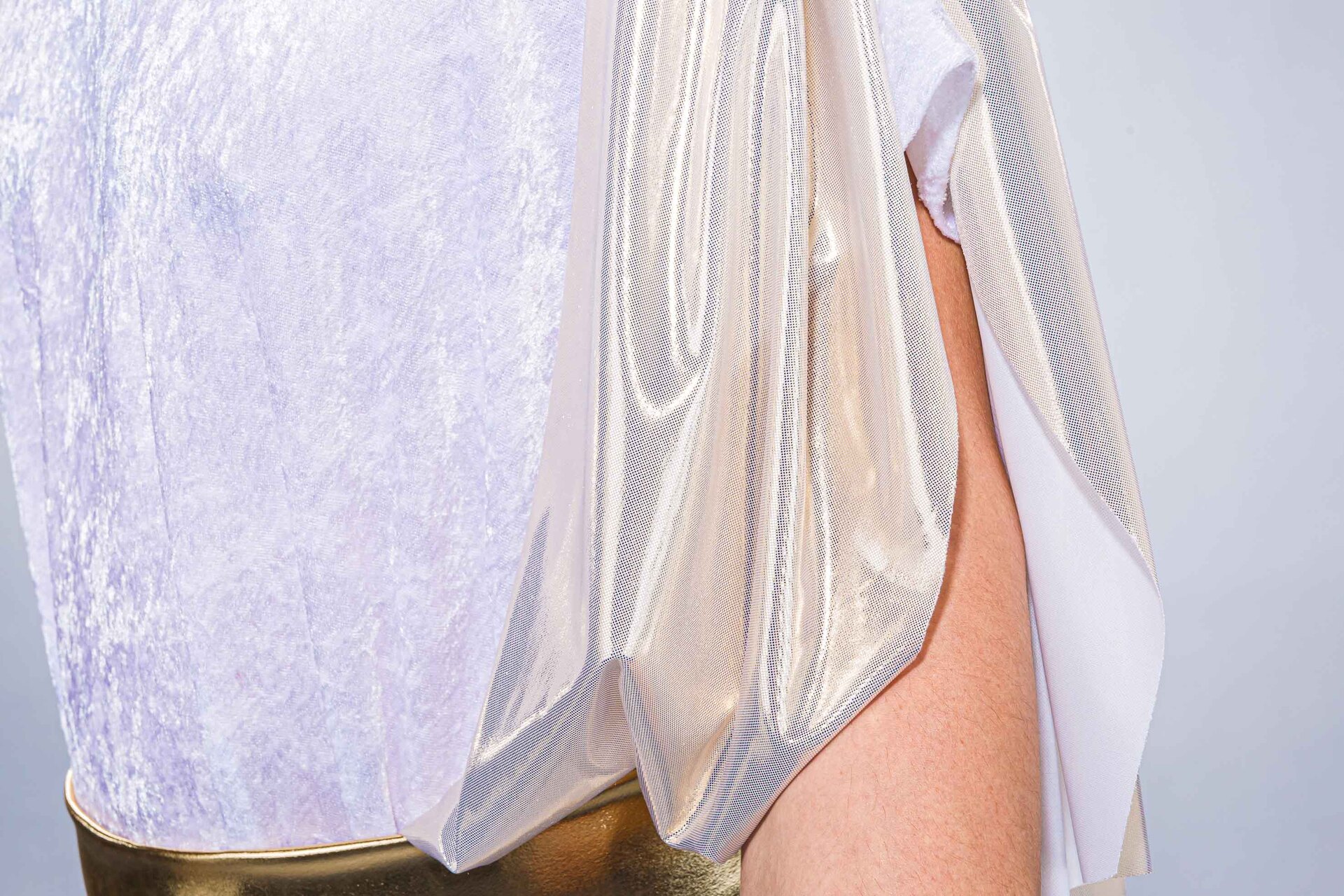 Toga aus Pannesamt mit angenähter Schulterschärpe aus fließender Goldfolie und goldenem Gürtel.