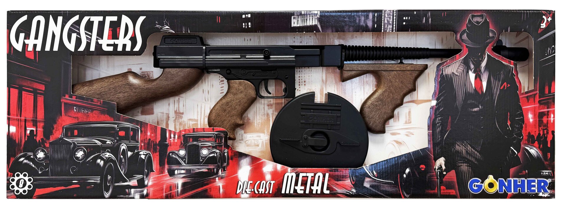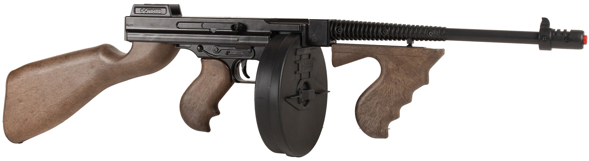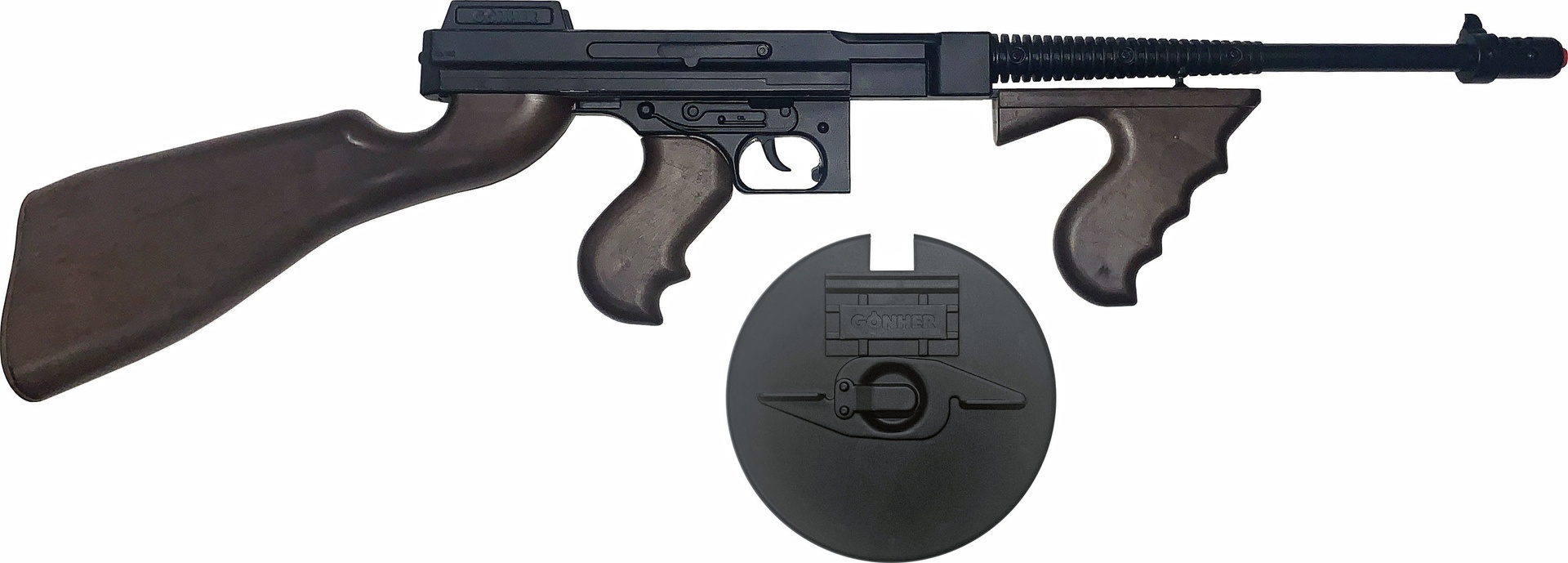 Maschinenpistole, bzw. -gewehr im Stil der 20er Jahre Gangster. Schwere Metallqualität mit abnehmbarem Trommelmagazin, Schulterstütze und zwei Pistolengriffen. Auf Knopfdruck klappt ein Ring im Gehäuse nach oben und kann mit 8 Schuss Ringen geladen werden.