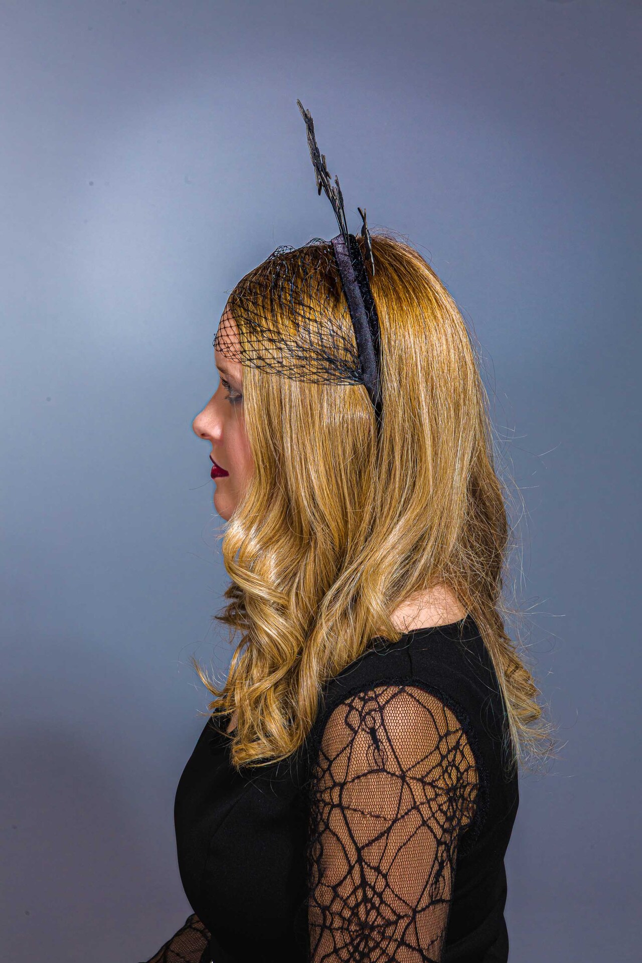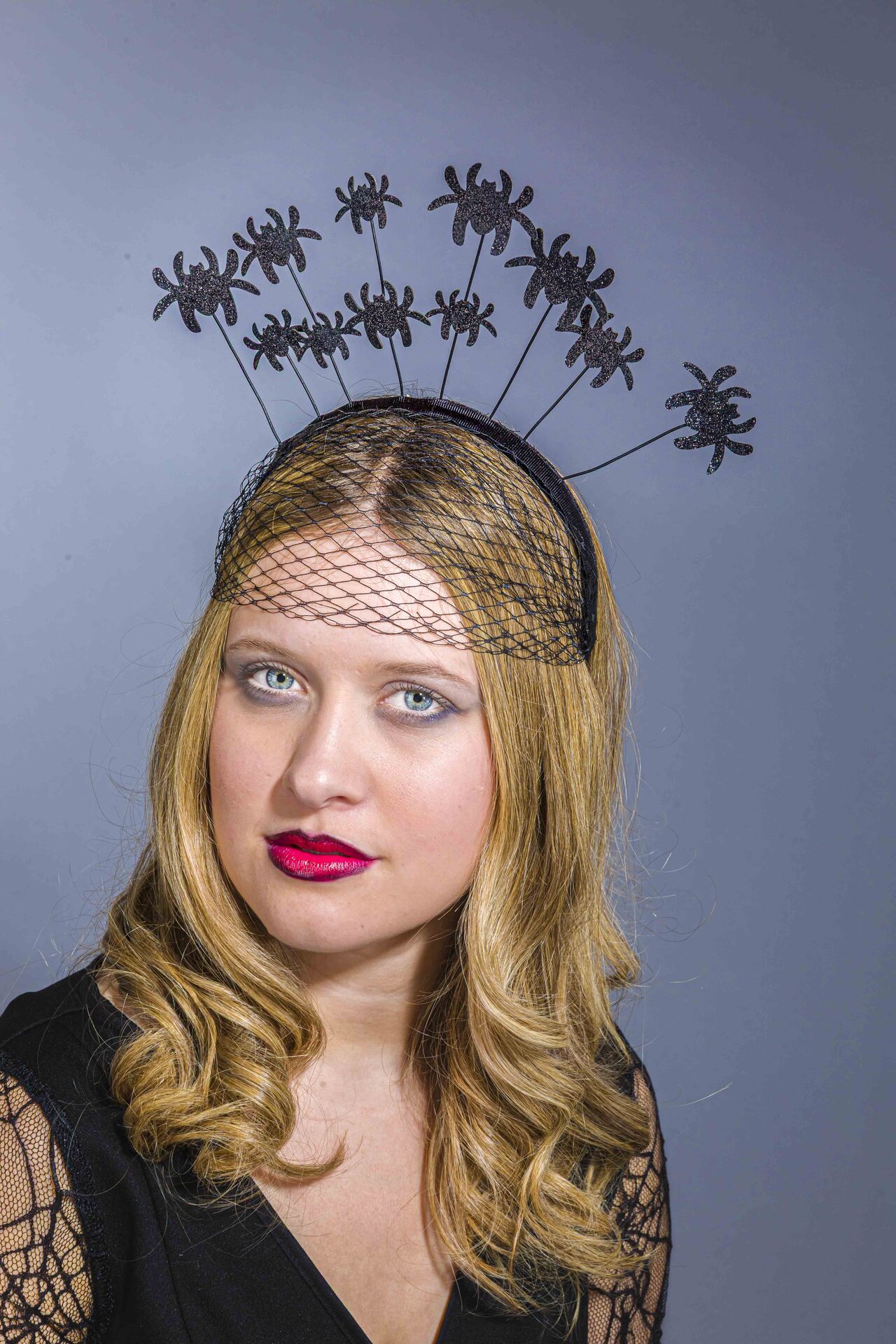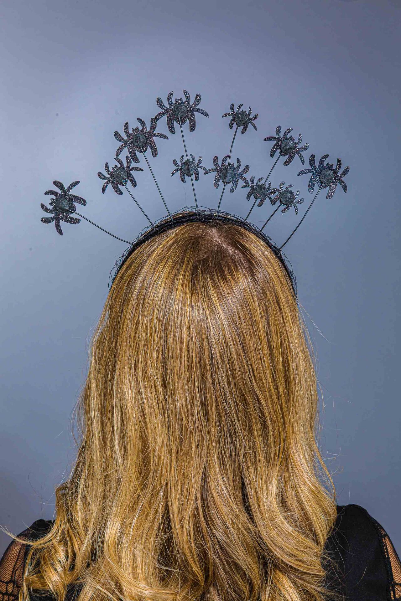 der ausgefallene Kopfschmuck passt wunderbar zu verschiedenen Dark-Night-Kostümen. Die beglitterten Spinnen sind ein Blickfang.