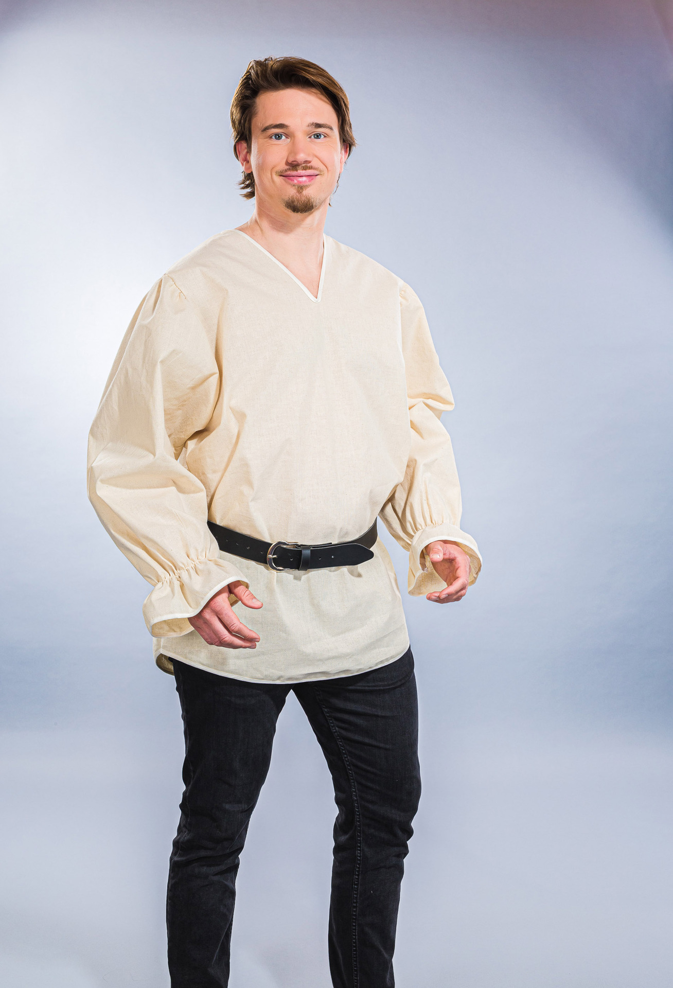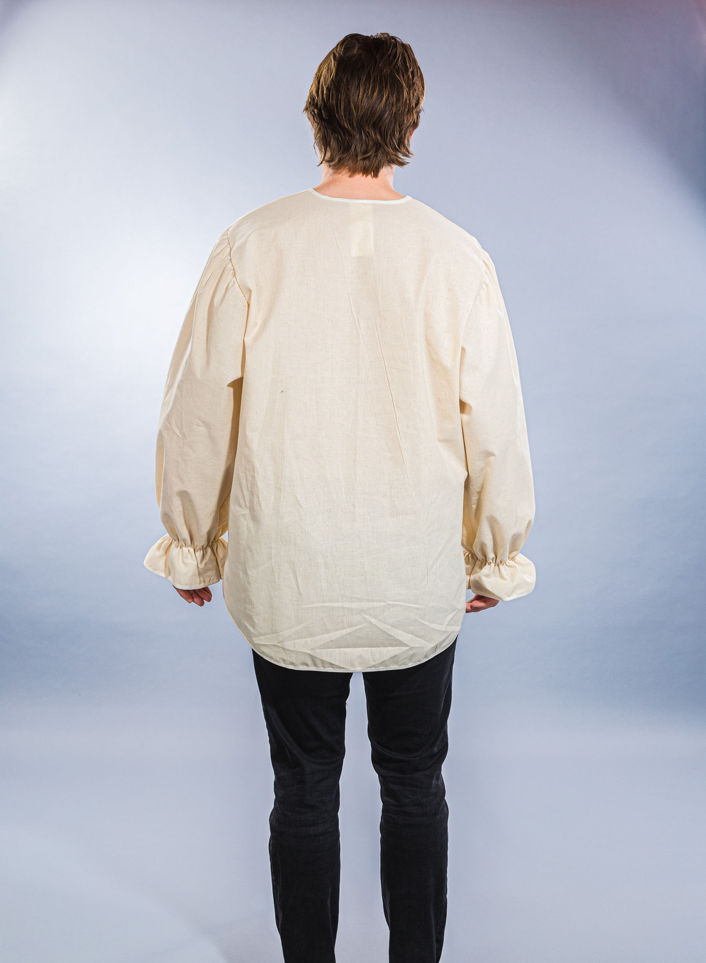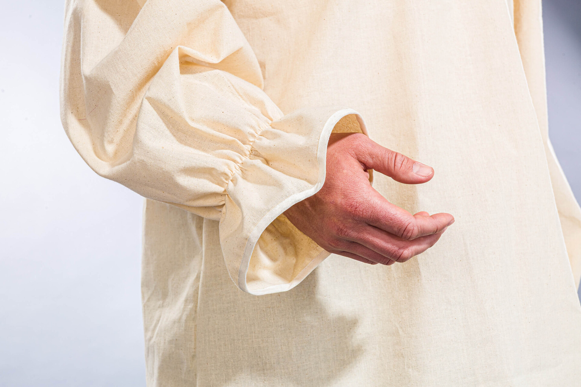 Ein vielseitig einsetzbares rustikales Herrenhemd aus naturfarbenem Nessel mit V-Ausschnitt und Gummizug in den Ärmelbündchen.