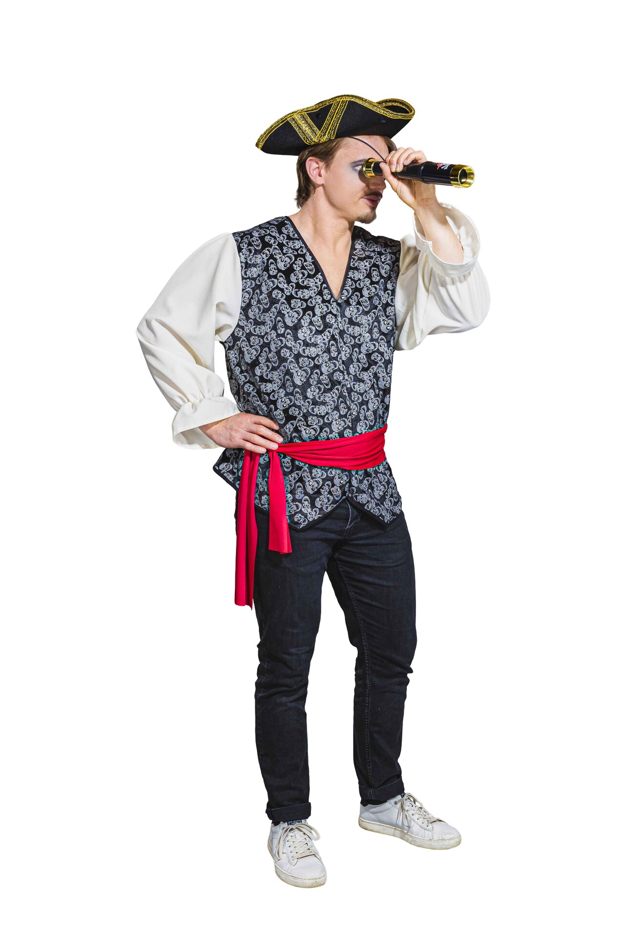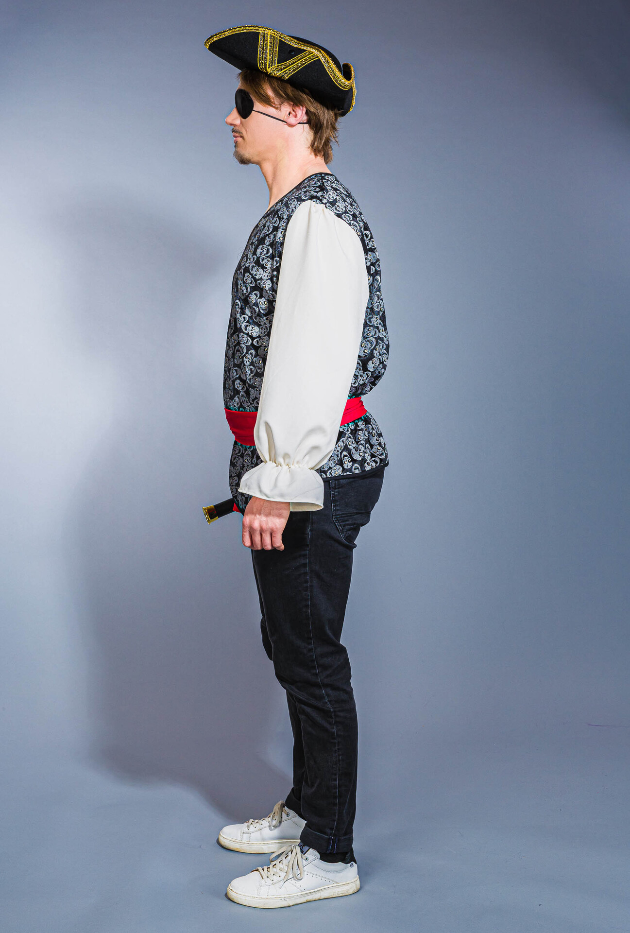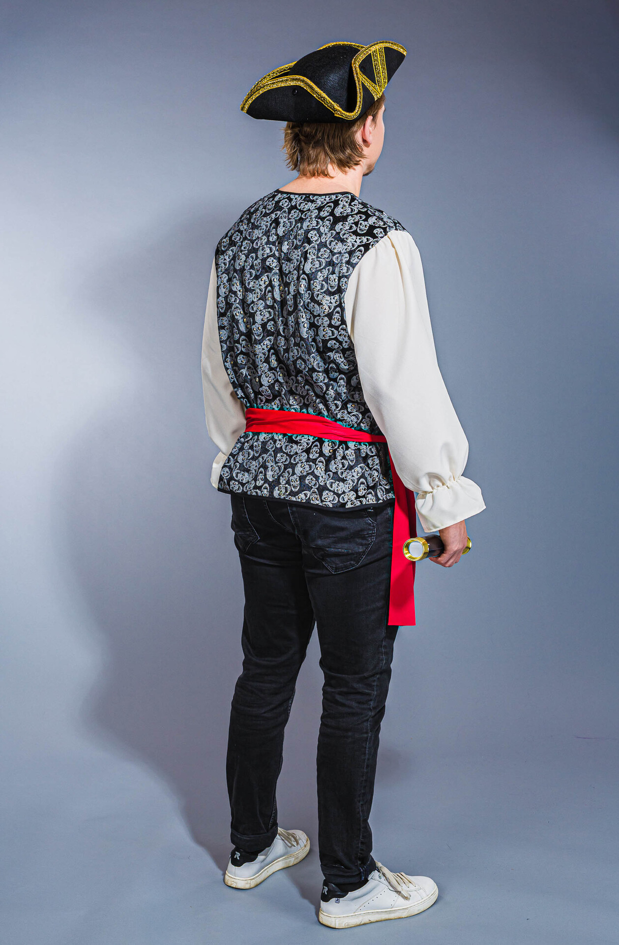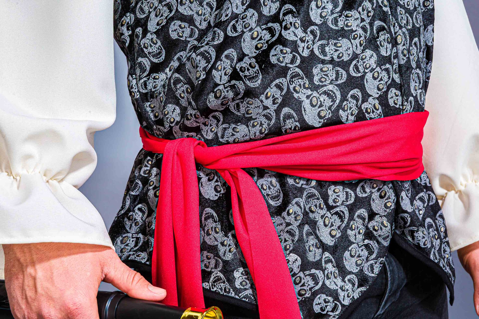 Geschlossenes Oberteil mit angedeuteter Weste aus schwarzem Pannesamt, bedruckt mit Totenköpfen und angenähten Ärmeln aus cremefarbenem Polyestergewebe. Der V-Ausschnitt garantiert ein leichtes An- und Ausziehen. Eine rote Schärpe aus elastischem Interlock komplettiert das Outfit.