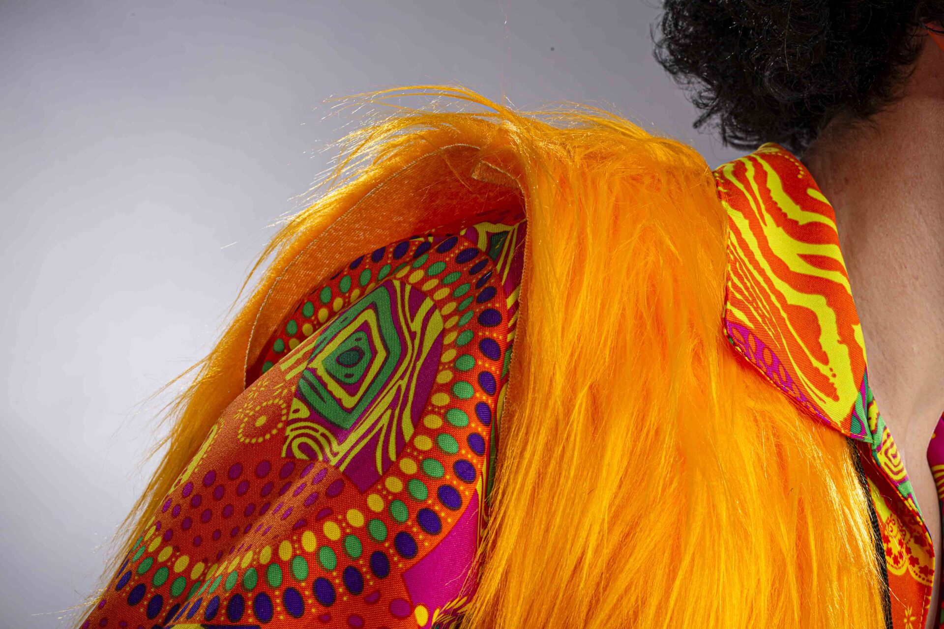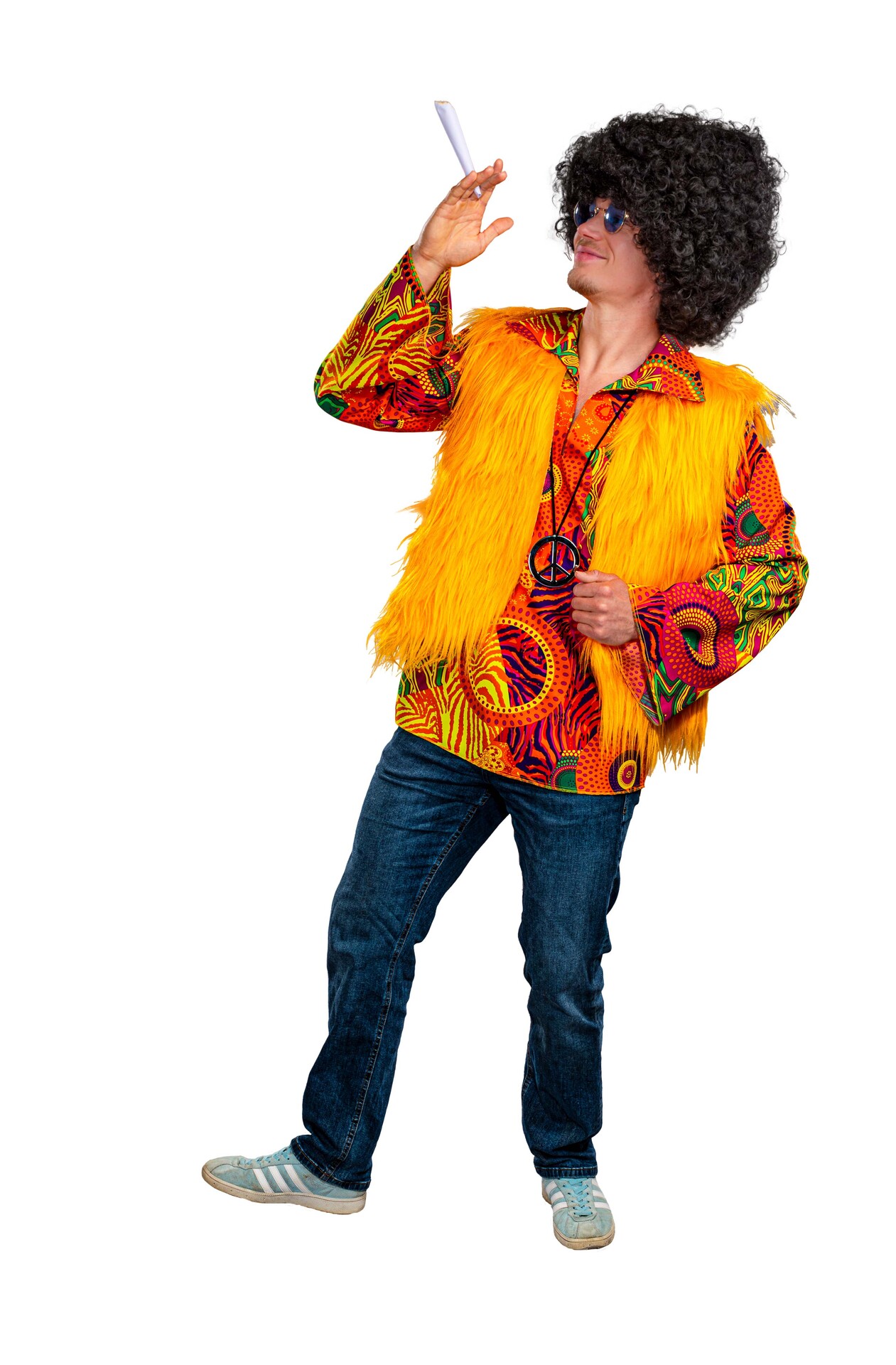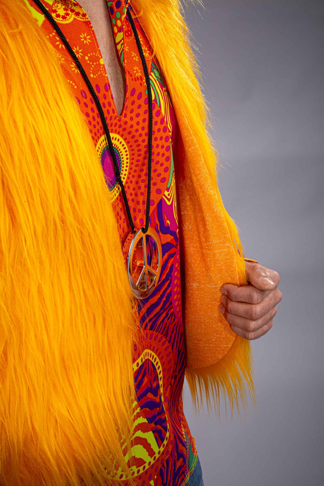 Diese Weste aus zotteligem Langflorplüsch in kräftigem Gelb ist die perfekte Ergänzung zu unseren Hippieblusen, passt aber ebensogut auf einen Rave.